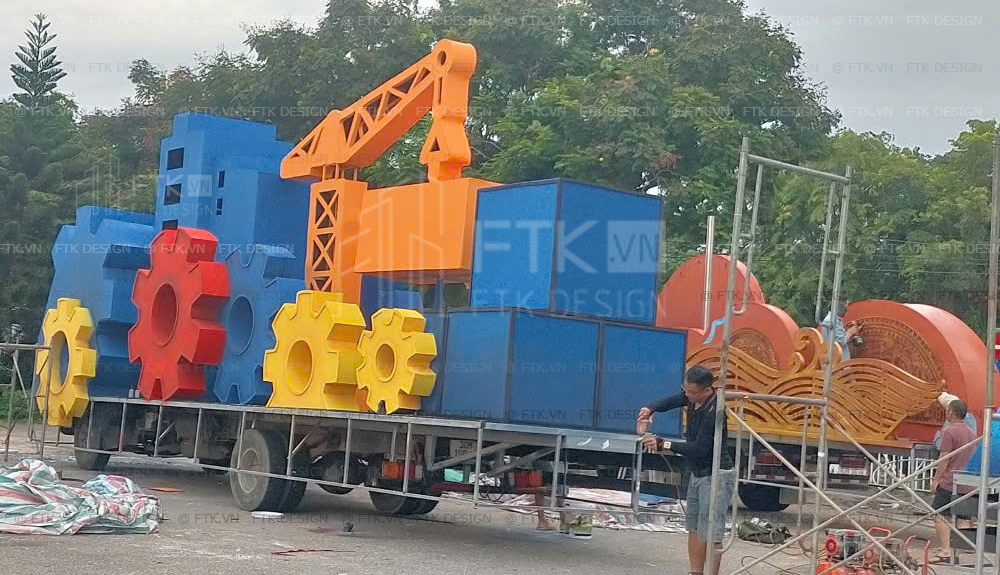 Thi công sản xuất mô hình trang trí cho xe diễu hành cần có sân bãi rộng lớn và đội ngũ thợ nhiều kinh nghiệm. FTK DESIGN có xưởng sản xuất rộng lớn tại 115 K2, Tân Mỹ, Mỹ Đình, Hà Nội, với kho vật tư, vật liệu đa dạng giúp tối ưu chi phí sản xuất xe mô hình.